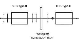 Dual wavelength waveplate is widely used on Third Harmonic Gener ation (THG) system. When you need a NLO crystal for type II SHG (o+e – e) and a NLO crystal for type II THG (o+e – e), the out put polarization from SHG can not be used for THG. So you must to turn the polarization to get two perpendicular polarization. Dual wavelength waveplate works like a polarization, it can rotate the polarization of one beam and keep another beam’s polarization.| ◆ Single plate ◆ DBAR Coating ◆ Type II SHG + Type II THG ◆ Type II SHG + Type I THG ◆ Type I SHG + Type I THG |